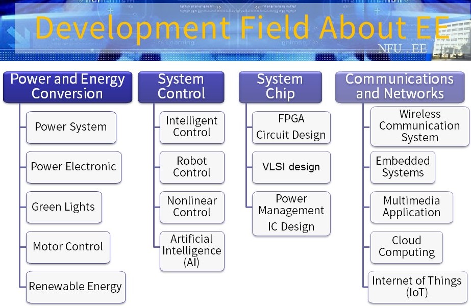 The development of this department is divided into four areas: power and energy processing, system control, system chips, communication, and networks. The aim is to cultivate technology-related industry professionals with practical abilities. In addition to strengthening theoretical teaching, practical training is also emphasized. Through the study of professional theories and the teaching of practical skills, in line with the development trends of various related fields such as power, control, electronics, integrated circuit design, communication, and computers, students are trained to become electrical engineering technology talents with practical abilities in system design, manufacturing, integration, and repair. This meets the requirements of the era and social needs. The goal of talent cultivation in this department is to meet the professional technical talent needs of related electrical industries.
