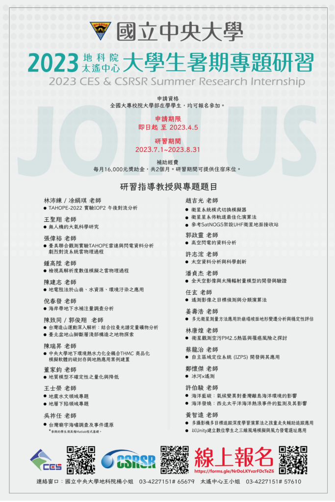 Registration Information for 2023 Summer Programs for College Students[Central University] 2023-03-22 Admin System 一、申請資格:本活動實施對象為各大專院校大學部在學學生。(不限系所)均可報名參加,研習期間為112年7月1日至8月31日。 二、報名日期:一律網路報名,即日起至112年4月5日止,申請者請至https://forms.gle/NrDoLKYvzrFDcTeZ6表單,填具相關資訊,詳細活動資訊可請至表單上活動網站查詢。