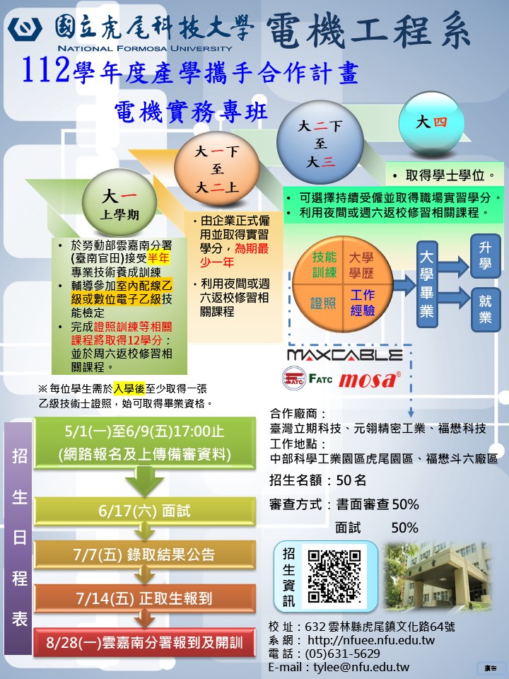 112 Academic Year Industry-University Cooperation Program Enrollment Guide for the Fourth Bachelor of Technology Class-Department of Electrical Engineering-Electrical Engineering Practice Class 2023-04-25 Admin System 112學年度產學攜手合作計畫四技學士專班招生簡章 簡章下載 : https://enrollstudents.nfu.edu.tw/content/40007/download/112/9261