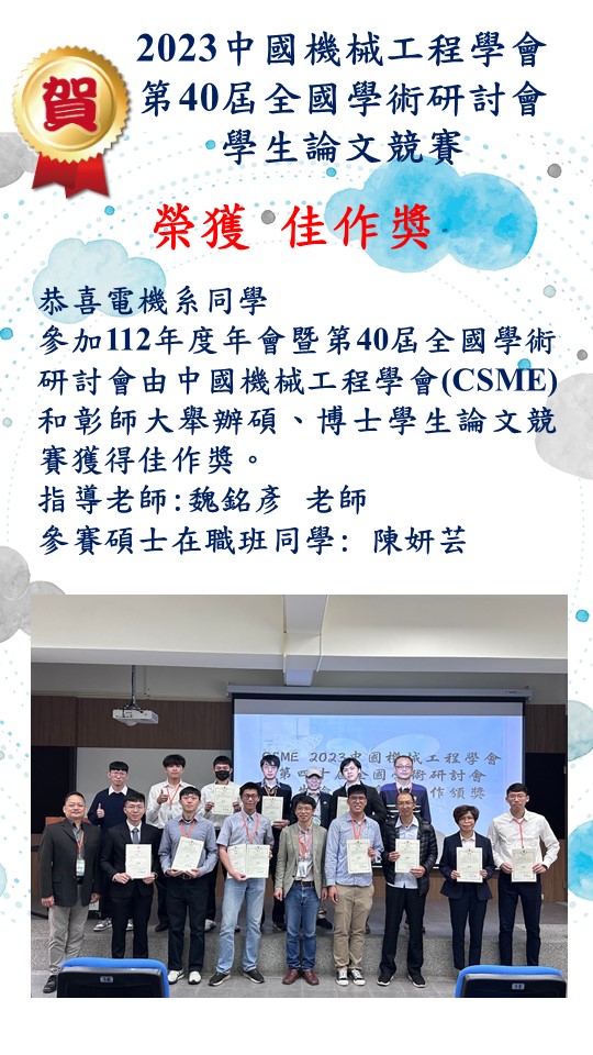2023 CSME (Chinese Society of Mechanical Engineering)-The 40th Seminar -Paper Competition 2023-11-25 Admin System 2023中國機械工程學會-第40屆全國學術研討會-學生論文競賽 榮獲佳作獎 指導老師: 魏銘彥老師