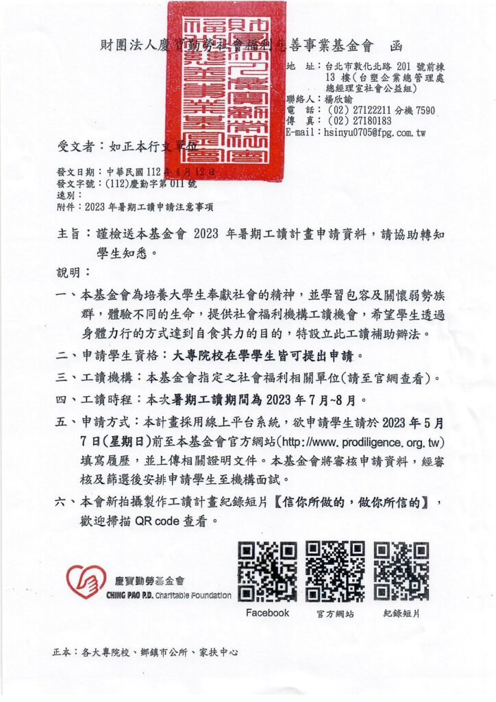 本次提供2023年「暑期」工讀計畫申請,歡迎大專院校學生申請慶寶勤勞基金會「社福機構工讀計畫」,為自己的人生開啟另一扇窗,注意事項如下: