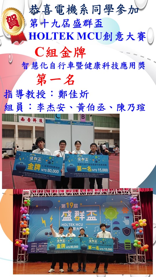 2024 The 19th Holtek MCU Creative Competition-(Hold By Holtek Semiconductor)-Group C NO.1 2024-12-22 Admin System 恭喜電機系同學參加第十九屆盛群盃HOLTEK MCU創意大賽- C組金牌智慧化自行車暨健康科技應用獎-第一名 【指導老師】鄭佳炘 老師