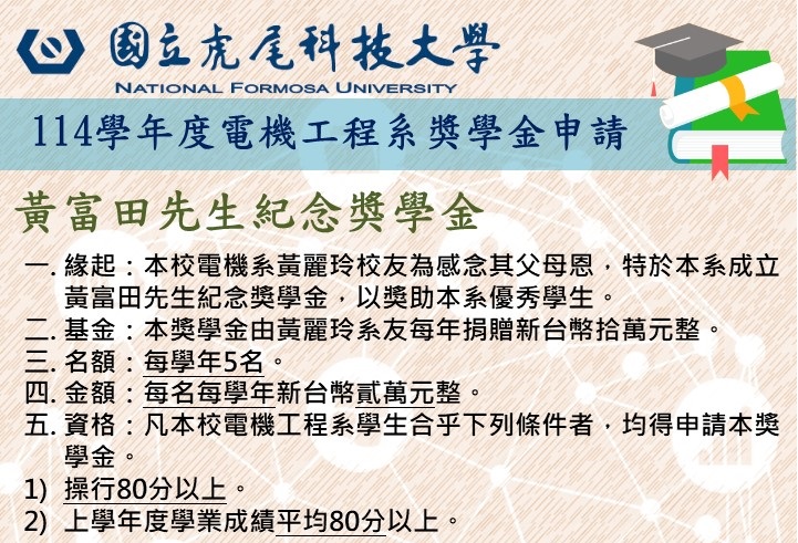 電機工程系-114學年度黃富田先生紀念獎學金申請辦法,請於114/9/30(二)前將申請表交至系辦。 2025-09-10 SystemAdmin 黃富田獎學金詳情請參考附件。欲申請獎學金之同學,請於114/9/30(二)前將申請表交至系辦。 檔案下載: 黃富田先生獎學金申請辦法111.09.14.odt 黃富田先生獎學金申請辦法111.09.14.pdf 黃富田先生獎學金申請辦法111.09.14.odt 黃富田先生獎學金申請辦法111.09.14.pdf