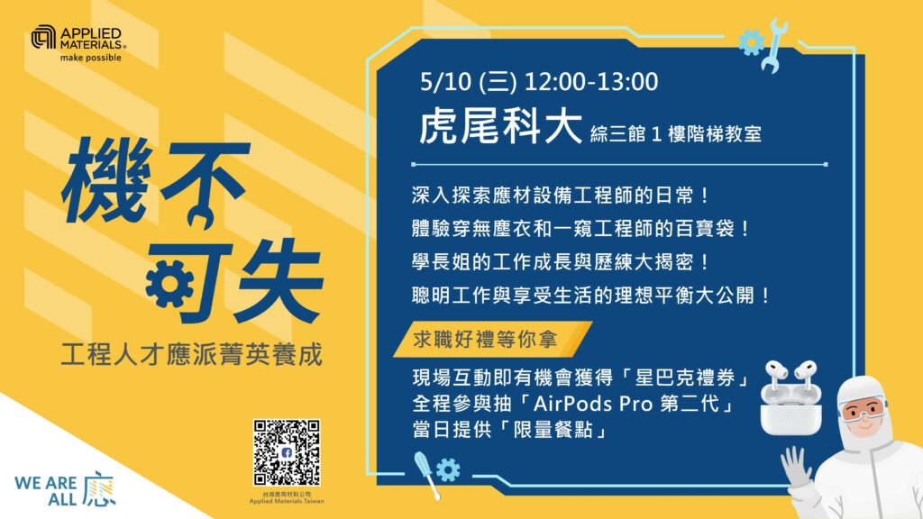 【2023年徵才訊息】台灣應用材料2023校園招募 -『機』不可失|工程人才 應派菁英養成-虎尾科大說明會 5/10 (三) 2023-04-20 SystemAdmin 『機』不可失,工程人才說明會,現場抽獎AirPods Pro 第二代及發送限量星巴克禮卷。 應材 #機不可失 前進雲林囉✨ 工程人才應派菁英養成,就從應材機不可失開始!讓學長姐帶你深入瞭解應材及設備工程師的全貌! 👉工程師職場大揭密 實際穿著無塵衣的特別體驗 好康享不完🎁 當天提供限量餐點 現場互動即有機會獲得星巴克禮卷 全程參與抽AirPods Pro第二代 ▪️ 活動時間:5/10 (三) 12:00-13:00 ▪️ 活動地點:虎尾科大 綜三館 1樓階梯教室 ▪️ 報名通道:https://forms.office.com/r/hCJ65h4Bkj ⚠️ 席次有限,額滿為止