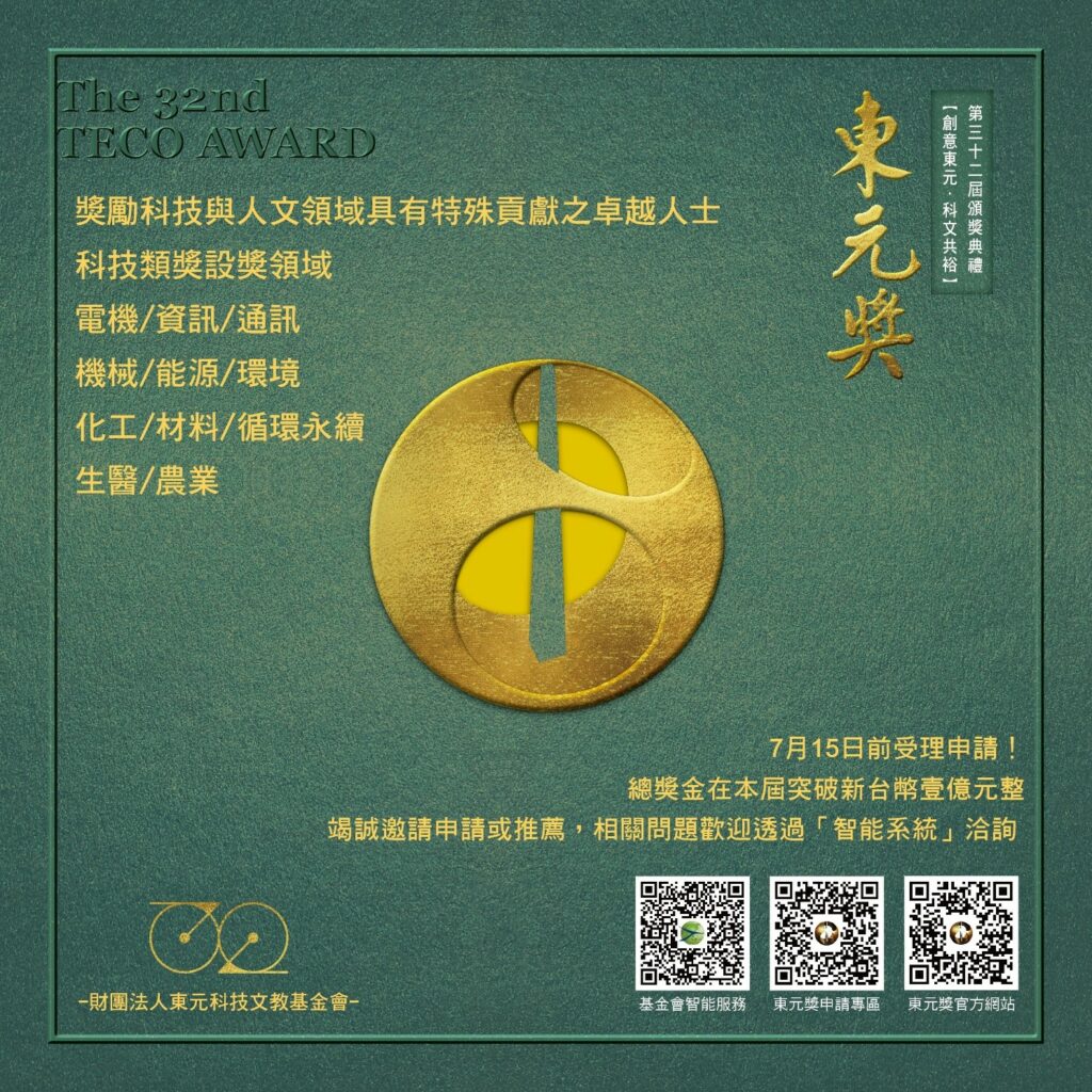 第32屆東元獎7月15日前「科技類獎」受理申請中-獎金將突破新臺幣壹億元整 2025-06-19 SystemAdmin 「東元獎」今年邁入第32屆,頒發獎金將突破新臺幣壹億元整! 科技類以四大領域設獎: 一、電機/資訊/通訊 二、機械/能源/環境 三、化工/材料/循環永續 四、生醫/農業 每領域各頒發獎金80萬元整,7月15日前受理申請。更多資訊詳見 申請專區 https://www.tecofound.org.tw/teco-award/2025/login.php 智能系統 https://lin.ee/FbSaezX 競賽簡介 https://teco.tecofound.org.tw/files/pages_175026439914hpfi748.pdf 官方網站 https://teco.tecofound.org.tw/zh-tw/pages/9 財團法人東元科技文教基金會 敬啟
