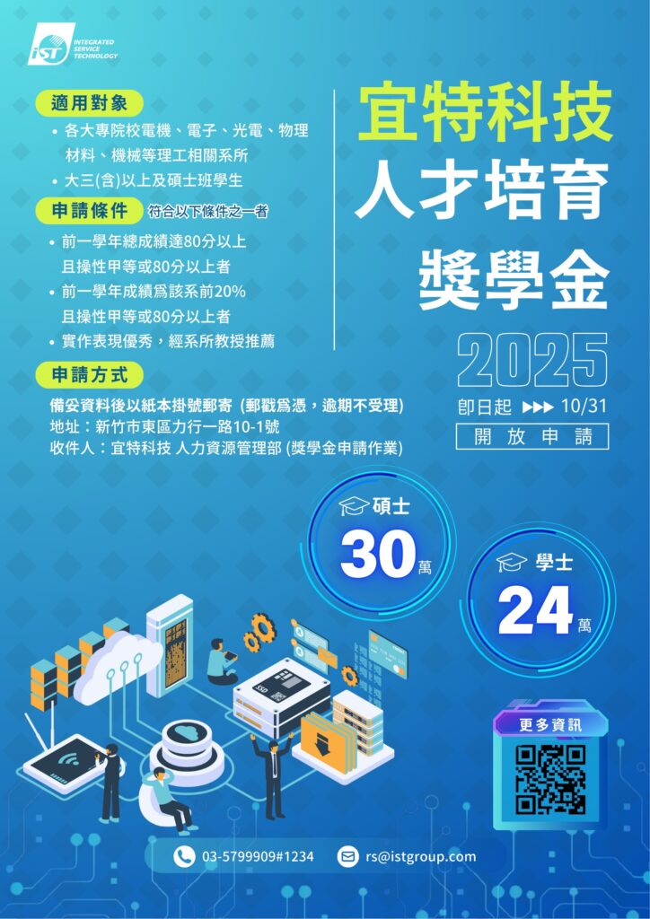 【徵才相關】2025宜特科技人才培育獎學金 2025-10-08 SystemAdmin 宜特科技長期關注學術發展,並看重貴系學生的傑出表現。為了支持青年學子,我們設立「人才培育獎學金」,期望能與貴系合作,共同鼓勵優秀學生。 以下是公司網址及粉專連結: 公司網址 粉絲專頁 附件: 宜特科技114年度【人才培育獎學金】申請表 宜特科技114年度【人才培育獎學金】作業辦法 宜特科技114年度【人才培育獎學金】申請表 宜特科技114年度【人才培育獎學金】作業辦法