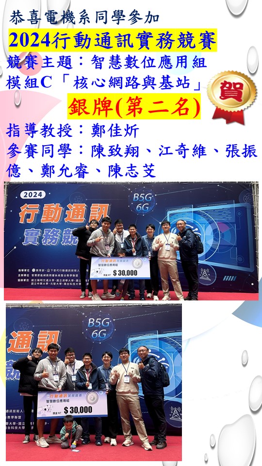 2024行動通訊實務競賽-智慧數位應用組-模組C 「核心網路與基站」銀牌(第二名) 2024-12-28 SystemAdmin 恭喜電機系同學參加2024行動通訊實務競賽競賽主題:智慧數位應用組模組C 「核心網路與基站」-銀牌(第二名)【指導老師】鄭佳炘 老師
