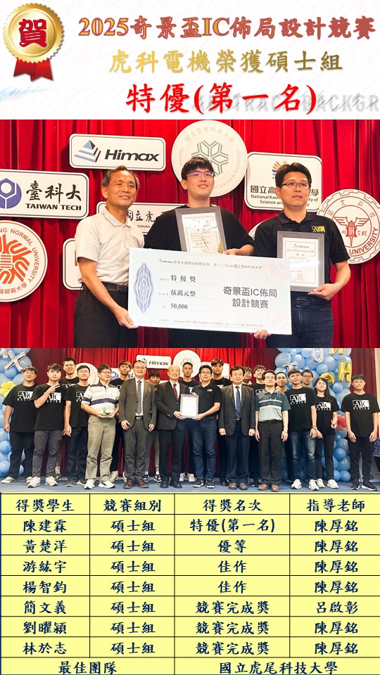 2025奇景盃IC佈局設計競賽-榮獲碩士組-特優、優等、佳作、競賽完成獎 2025-09-12 SystemAdmin 恭喜電機系同學參加2025奇景盃IC佈局設計競賽-榮獲碩士組-特優、優等、佳作、競賽完成獎等。 【指導老師】陳厚銘 老師