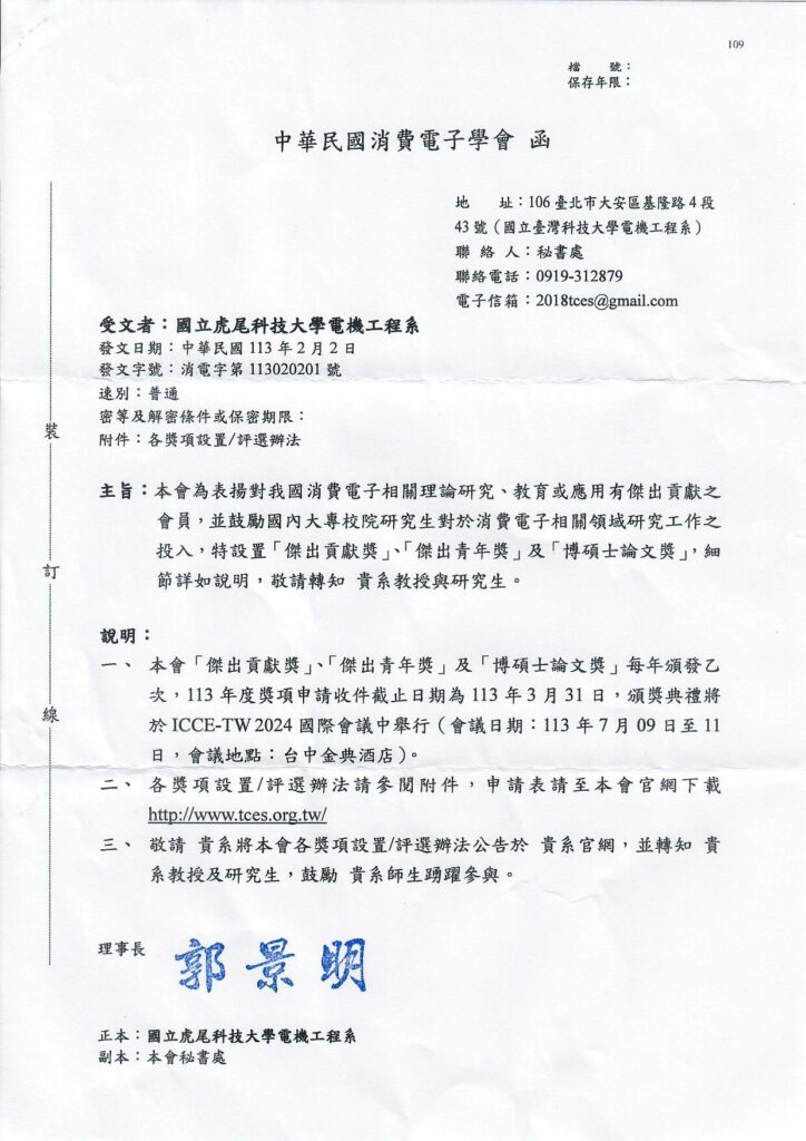 中華民國消費電子學會-傑出青年獎、傑出貢獻獎、博碩士論文獎-申請收件截止日113年3月31日 2024-02-22 SystemAdmin 請參考中華民國消費電子學會網站公告: 學會獎項/AWARD 傑出青年獎設置辦法 傑出貢獻獎設置辦法 博碩士論文設置辦法