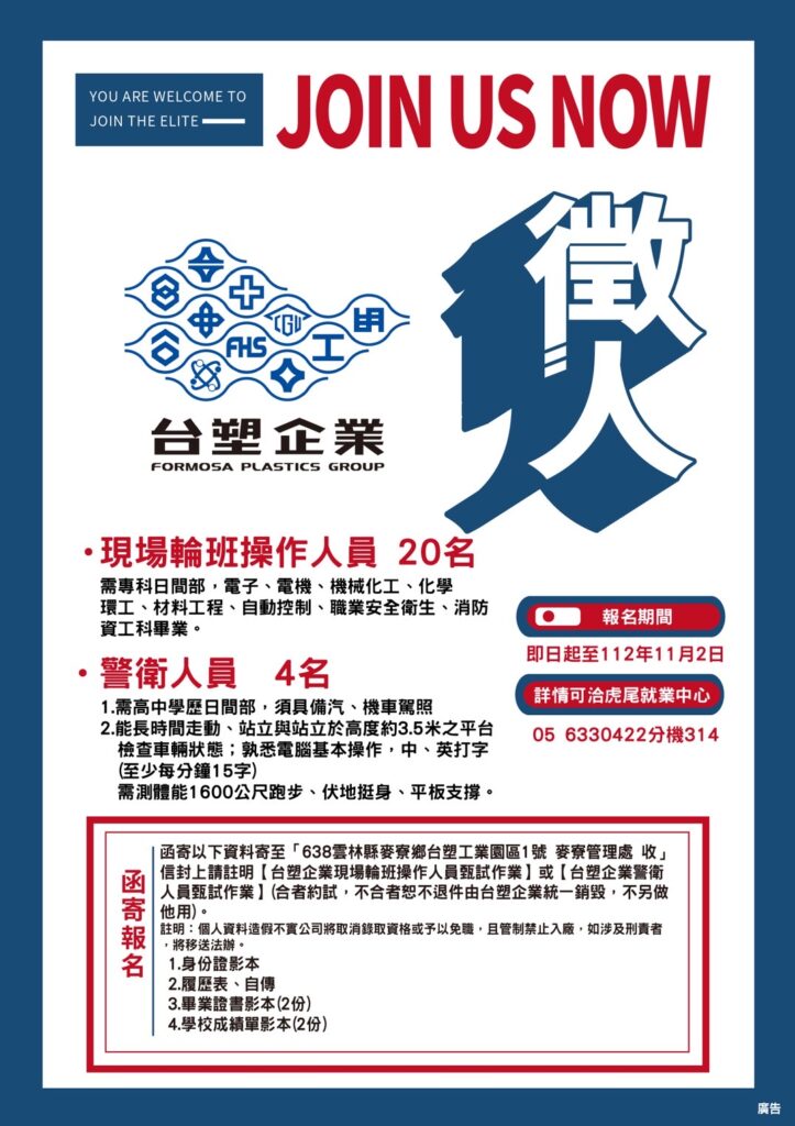 台塑企業招募案  (工作地點:麥寮鄉)