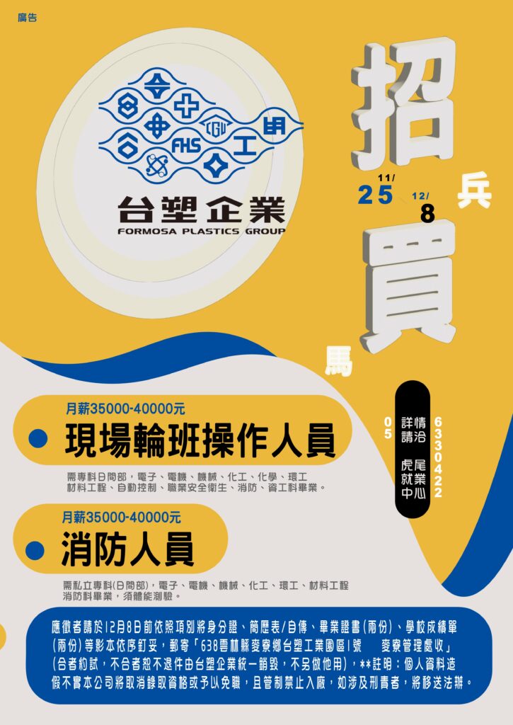 【徵才訊息】轉知台塑企業招募案 (工作地點:麥寮鄉) 2023-12-05 SystemAdmin 台塑企業招募案 (工作地點:麥寮鄉)職缺:1、現場輪班操作人員(1)學歷:專科以上(日間部)(2)科系:電子、電機、機械、化工、化學、環工材料工程、自動控制、職業安全衛生、消防、資工科畢業2、消防人員(1)學歷:高中學歷日間部(2)須體能測驗 ※有意者,請於12/8前函寄以下資料(1)身份證影本(2)履歷表、自傳(3)畢業證書影本(2份)(4)學校成績單影本(2份)依序訂妥「函寄638雲林縣麥寮鄉台塑工業園區1號 麥寮管理部收」(合者約試,不合者恕不退件,由台塑企業統一銷毀,不另做他用)註明:個人資料造假不實公司將取消錄取資格或予以免職,且管制禁止入廠,如涉及刑責者,將移送法辦
